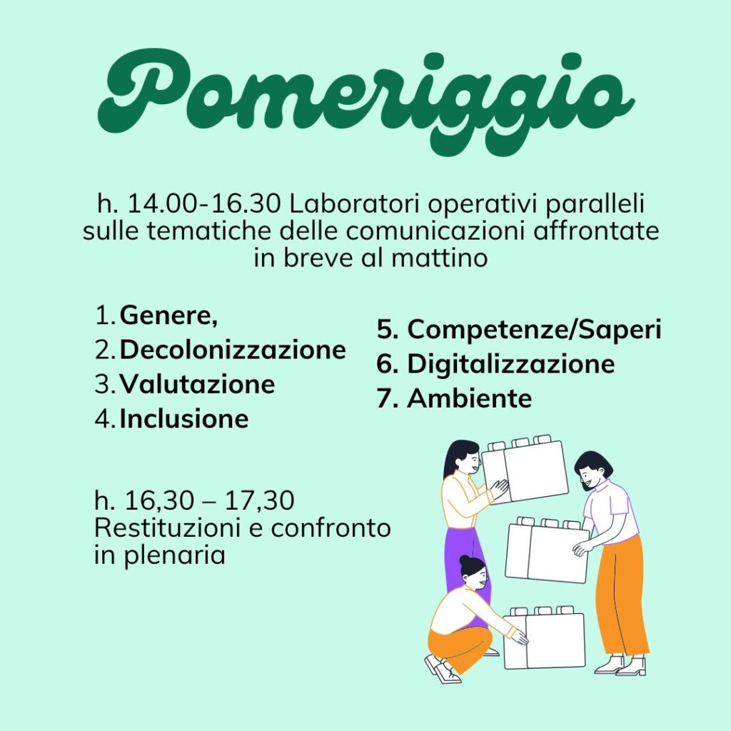 h. 14.30: laboratori paralleli sulle tematiche delle comunicazioni affrontate in breve al mattino